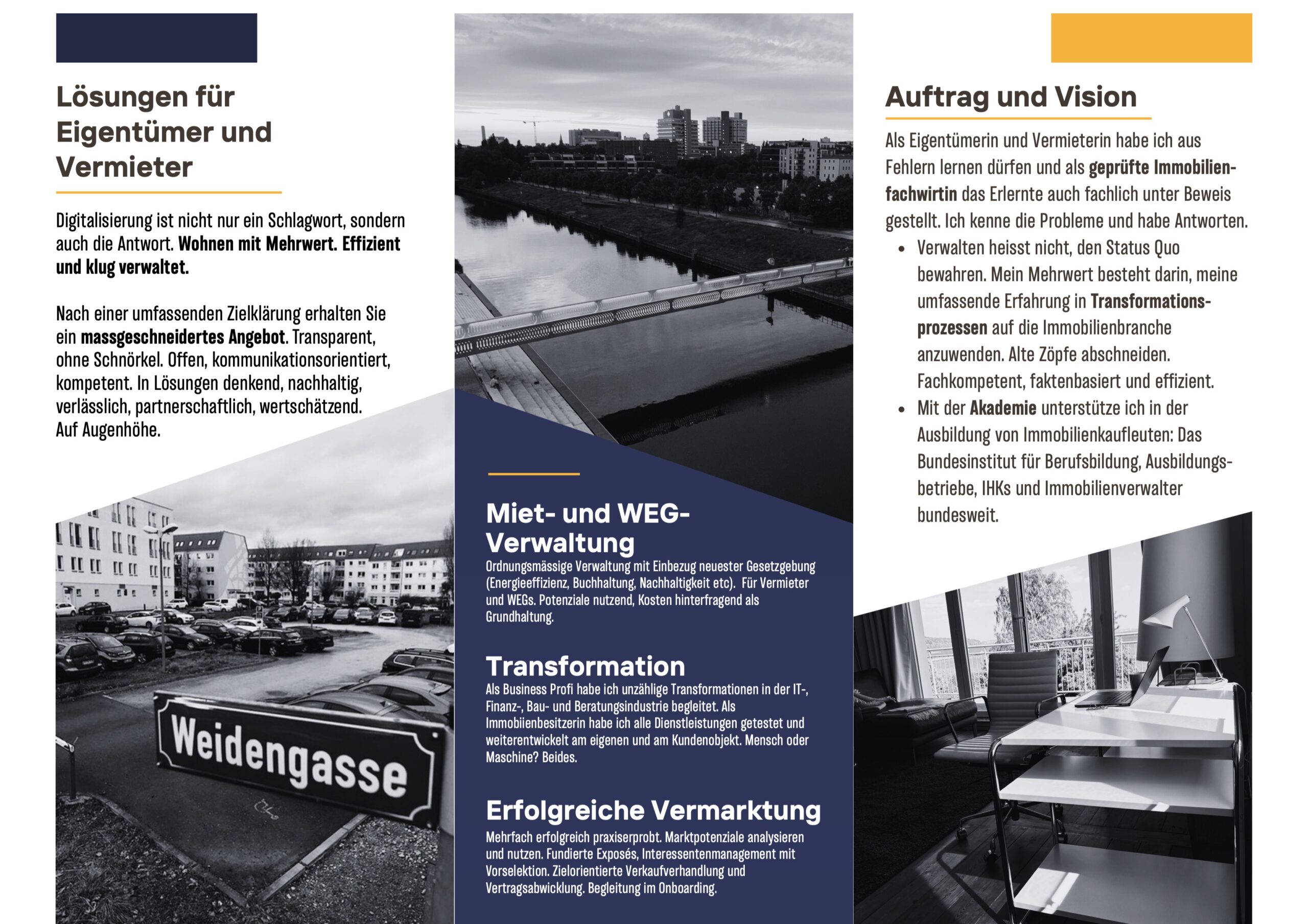 Es ist mir gelungen, meine Fähigkeiten aus der Industrie in eigenen als auch in fremdbetreuten Immobilien- und Verwaltungsprojekten einzubringen. Meine Kunden sind WEGs, Vermieter und Immobilienverwalter, die die Expertise in der Immobilienverwaltung, im Bauprojektmanagement, im Vertrieb und der Maklertätigkeit schätzen. Meine praktischen Erfahrungen habe ich u.a. durch Studium des Immobilienrechts, der Unternehmenssteuerung und -kontrolle bereichern können. Dies umfasst die Zulassung zum zertifizierten Verwalter (§26 WEG) und die Zulassung zum Immobilienmakler, Darlehensvermittler, Bauträger, Baubetreuer, Wohnimmobilienverwalter nach §34c der Gewerbeordnung.